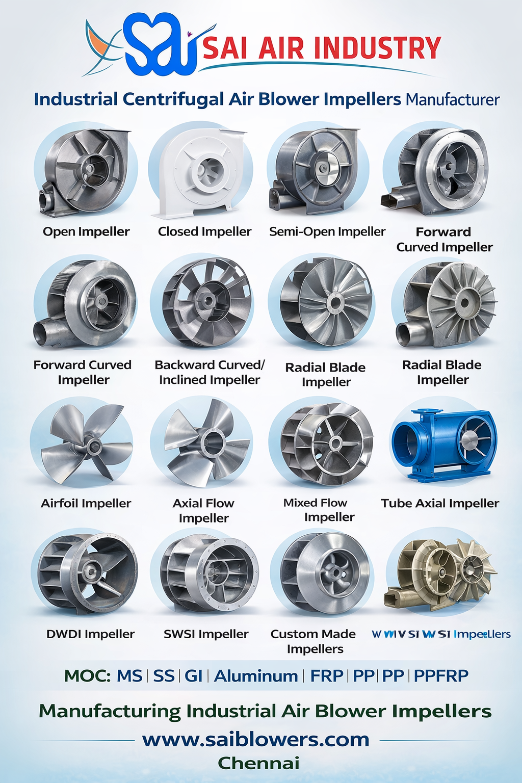 SAI AIR INDUSTRY manufactures and supplies high-performance centrifugal air blower impellers suitable for various industrial ventilation, process air, and pollution control systems. Our impellers are designed for high efficiency, durability, and balanced performance for different airflow and pressure requirements.